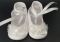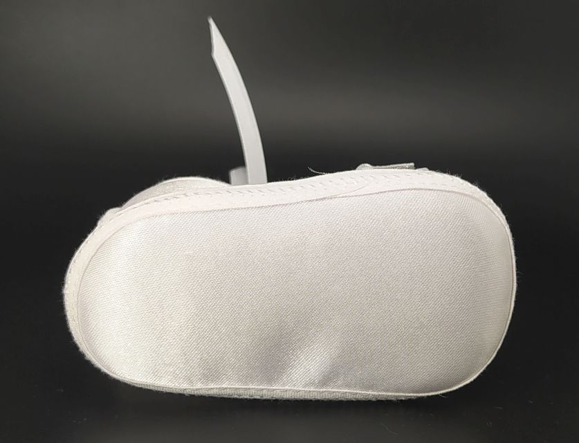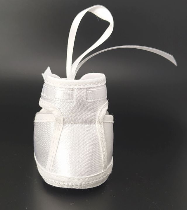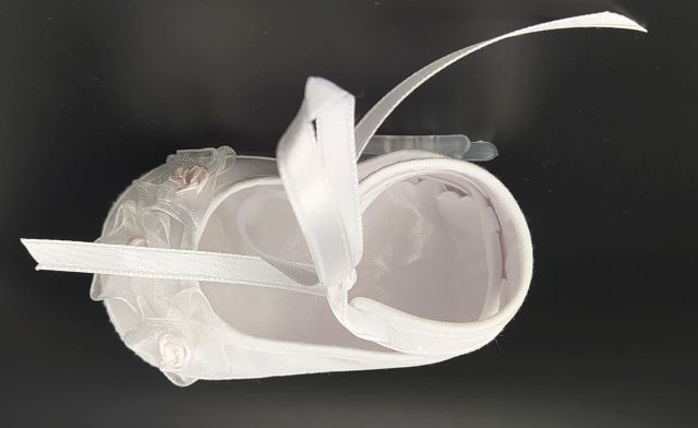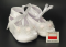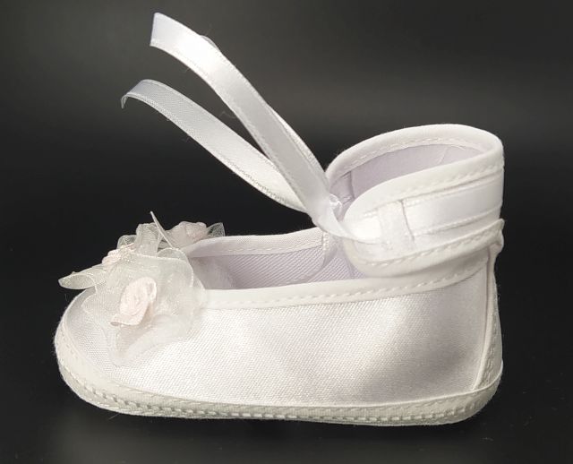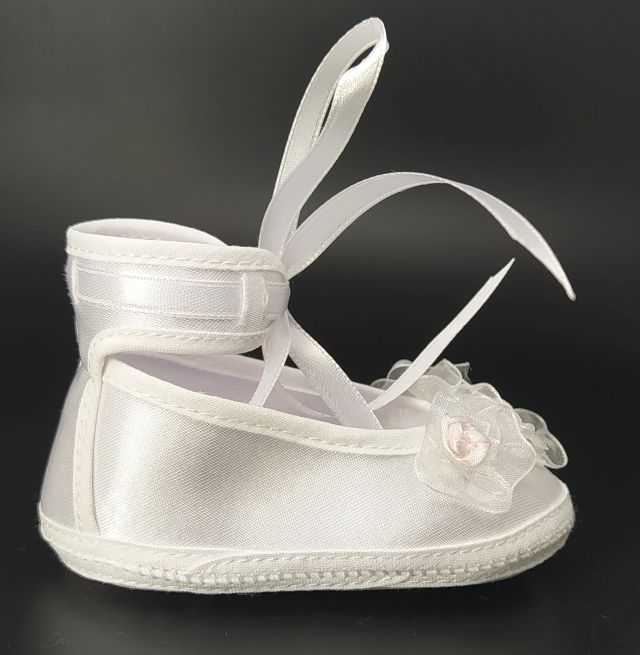 Przepiękne buciki wykonane z białego atłasu , zawiązywane taśmą atłasową .