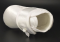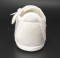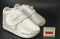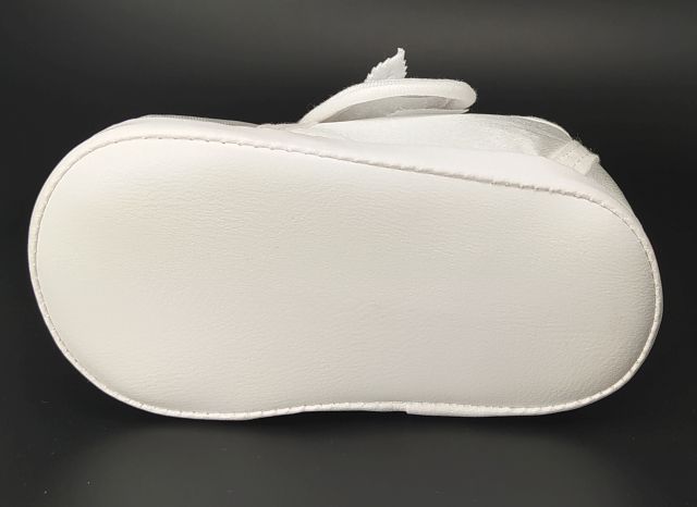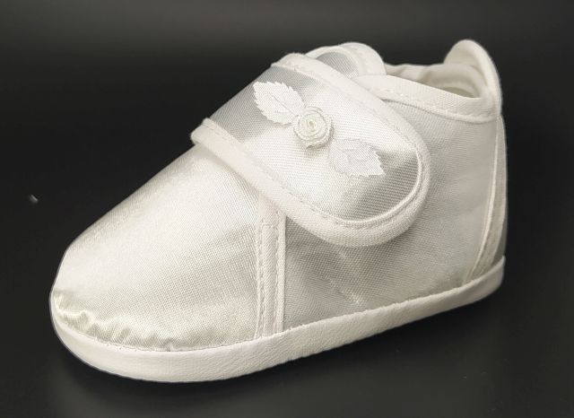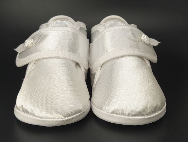 Przepiękne buciki wykonane z białego atłasu , zapinane na rzep z ozdobą .