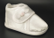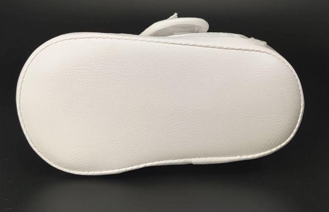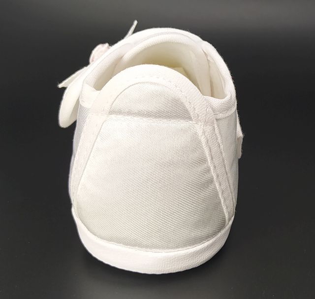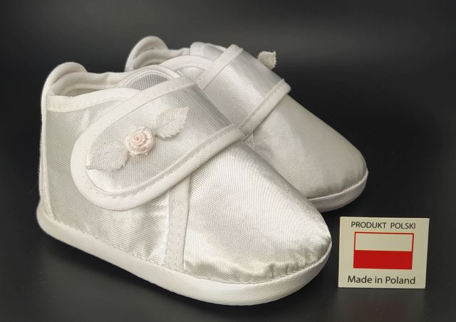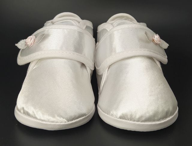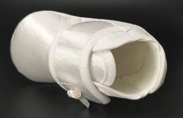 Przepiękne buciki wykonane z białego atłasu , zapinane na rzep z ozdobą .