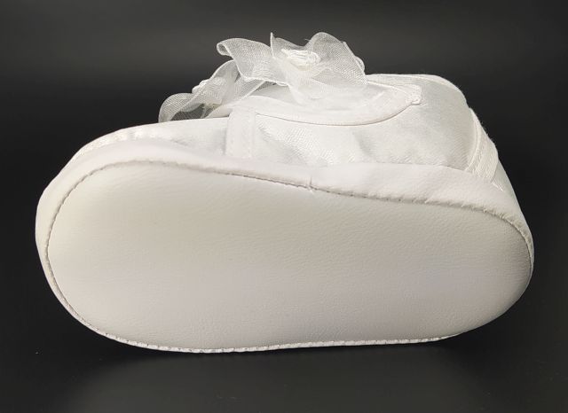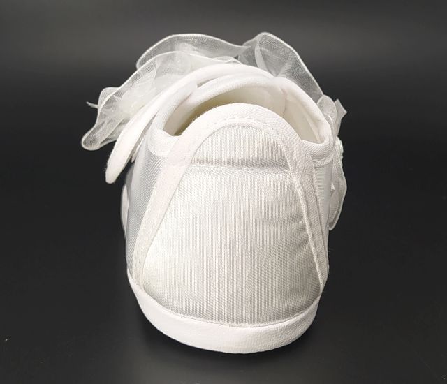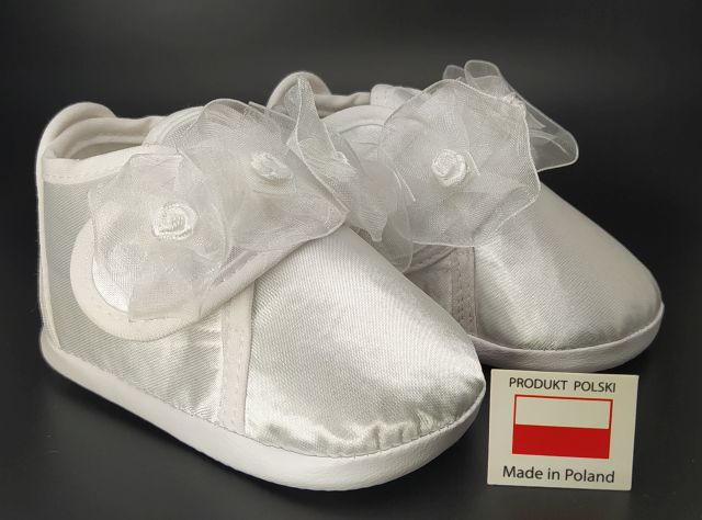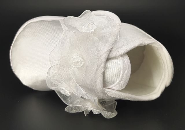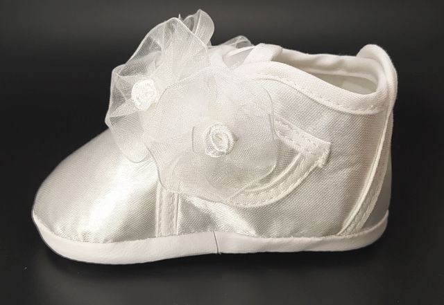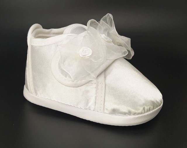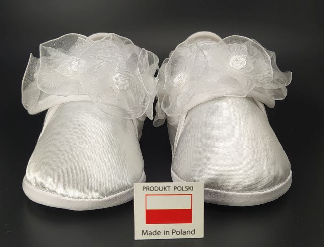 Przepiękne buciki wykonane z białego atłasu , zapinane na rzep z ozdobą .
