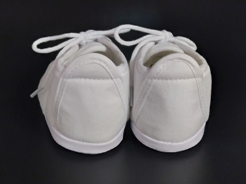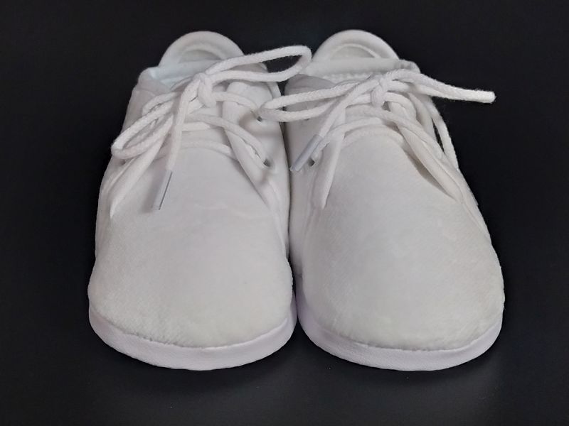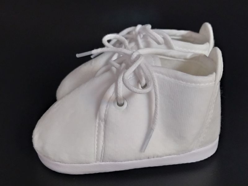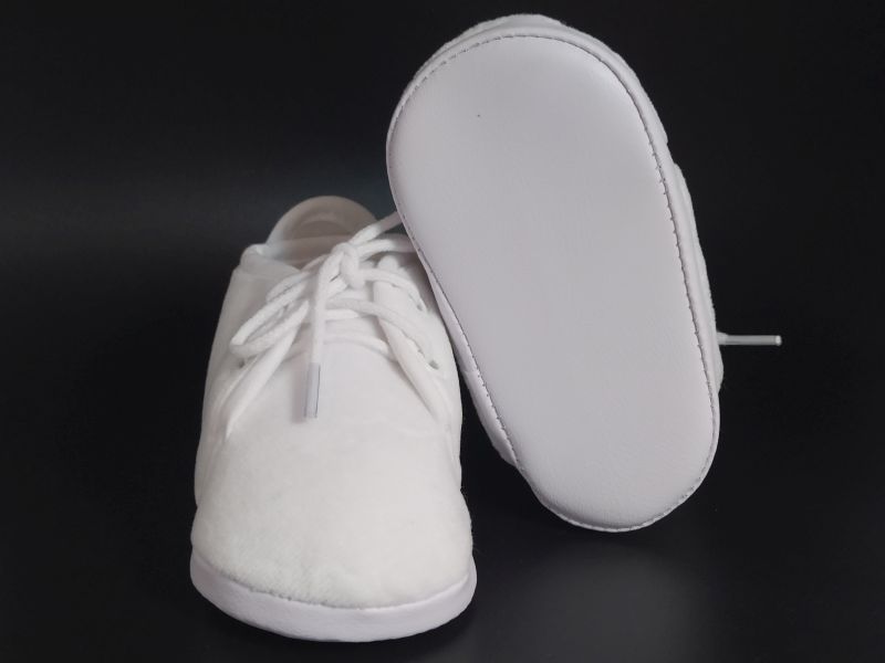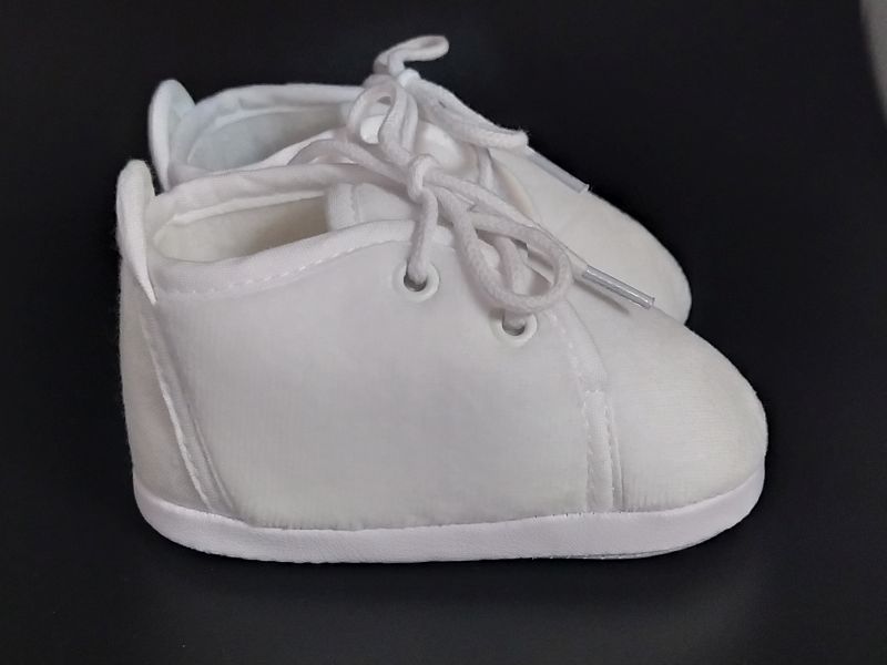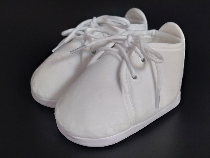 Przepiękne buciki wykonane z białego weluru , zawiązywane białą sznurówką .