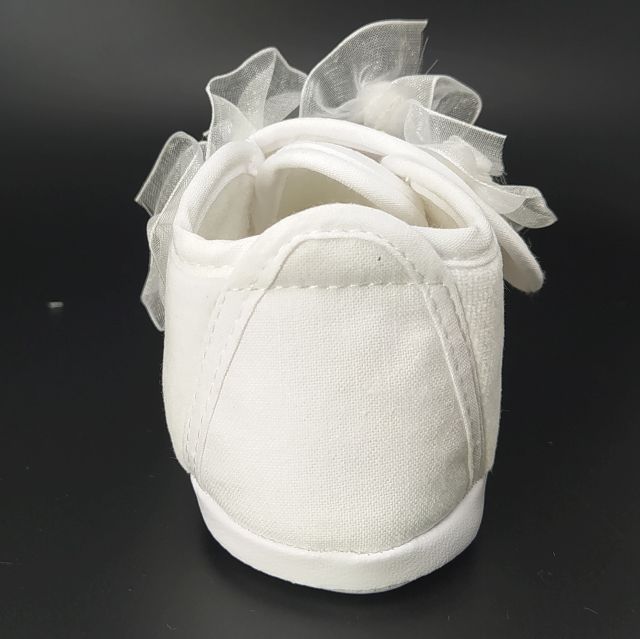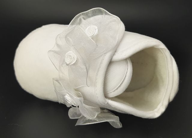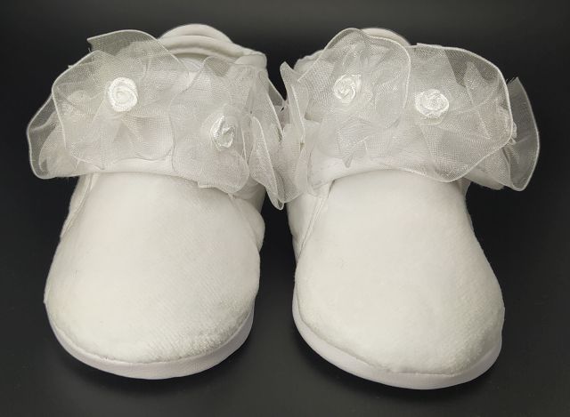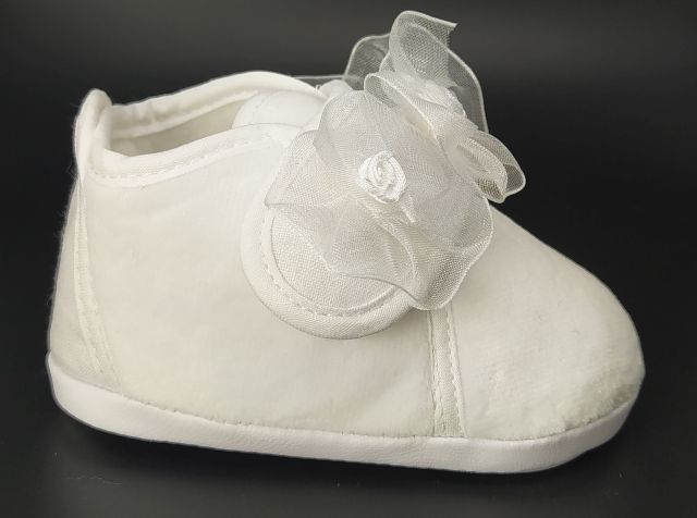 Przepiękne buciki wykonane z białego weluru , zapinane na rzep z ozdobą .