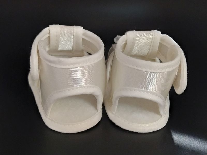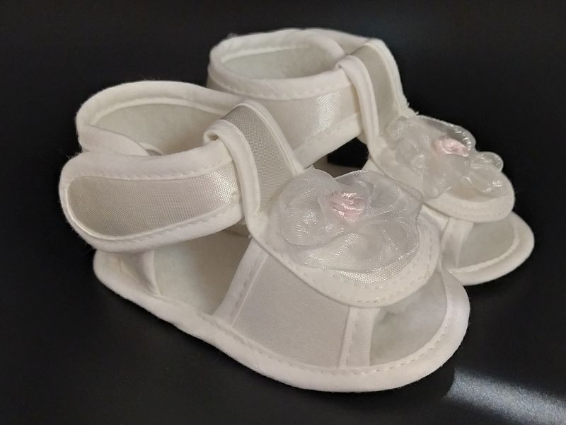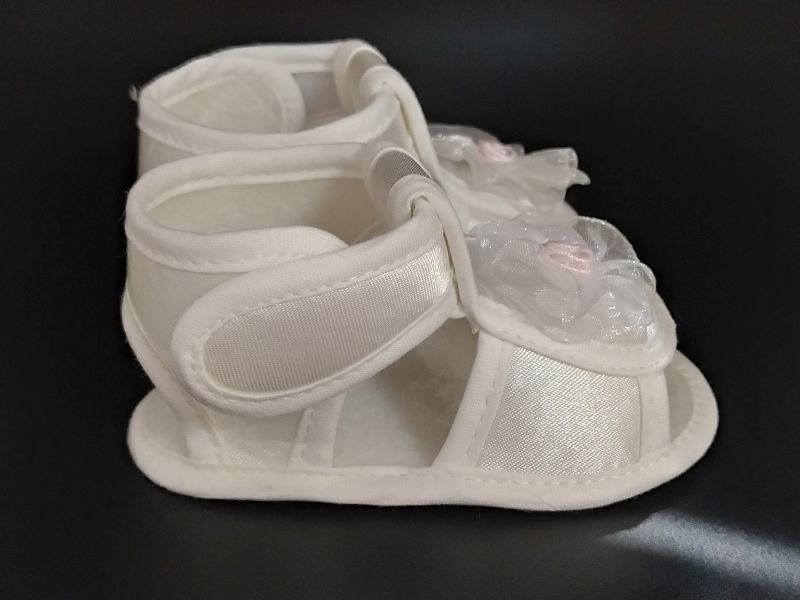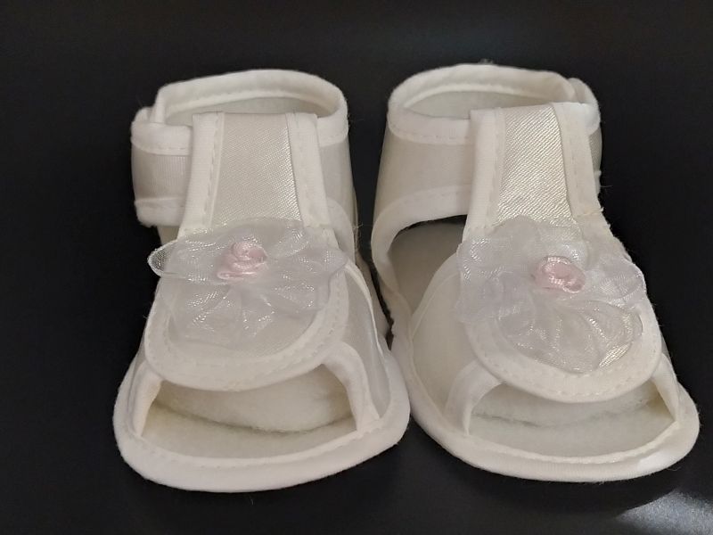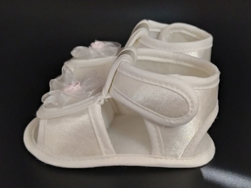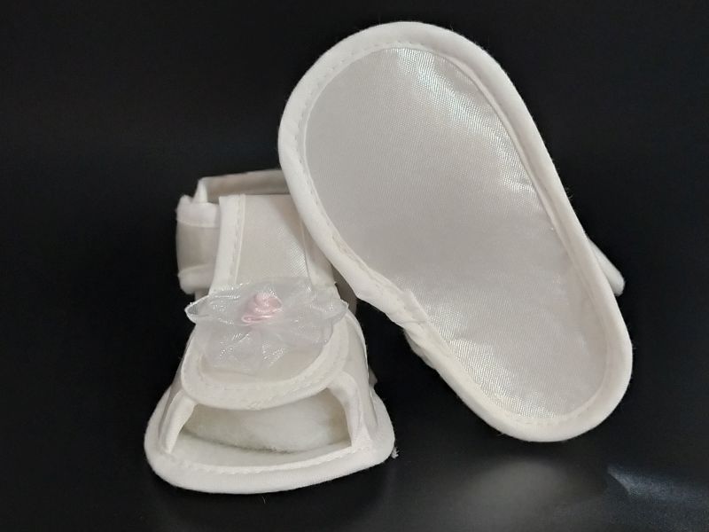 Buciki niemowlęce do chrztu , zapinane na rzep , z ozdobą z przodu bucika .