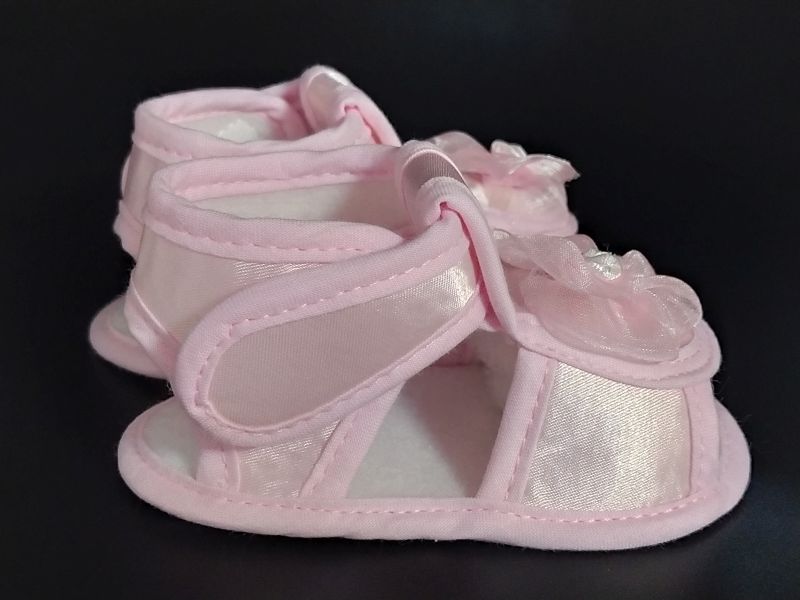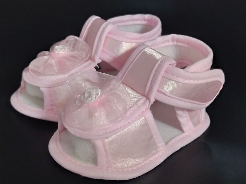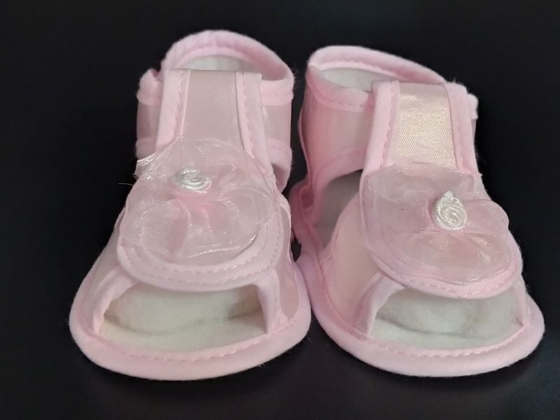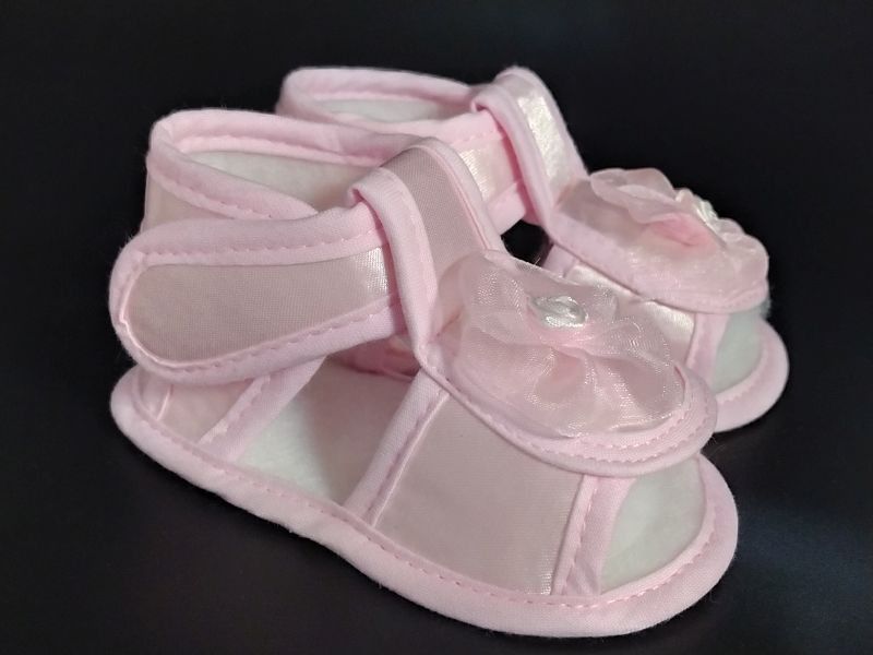 Buciki niemowlęce do chrztu , zapinane na rzep , z ozdobą z przodu bucika .