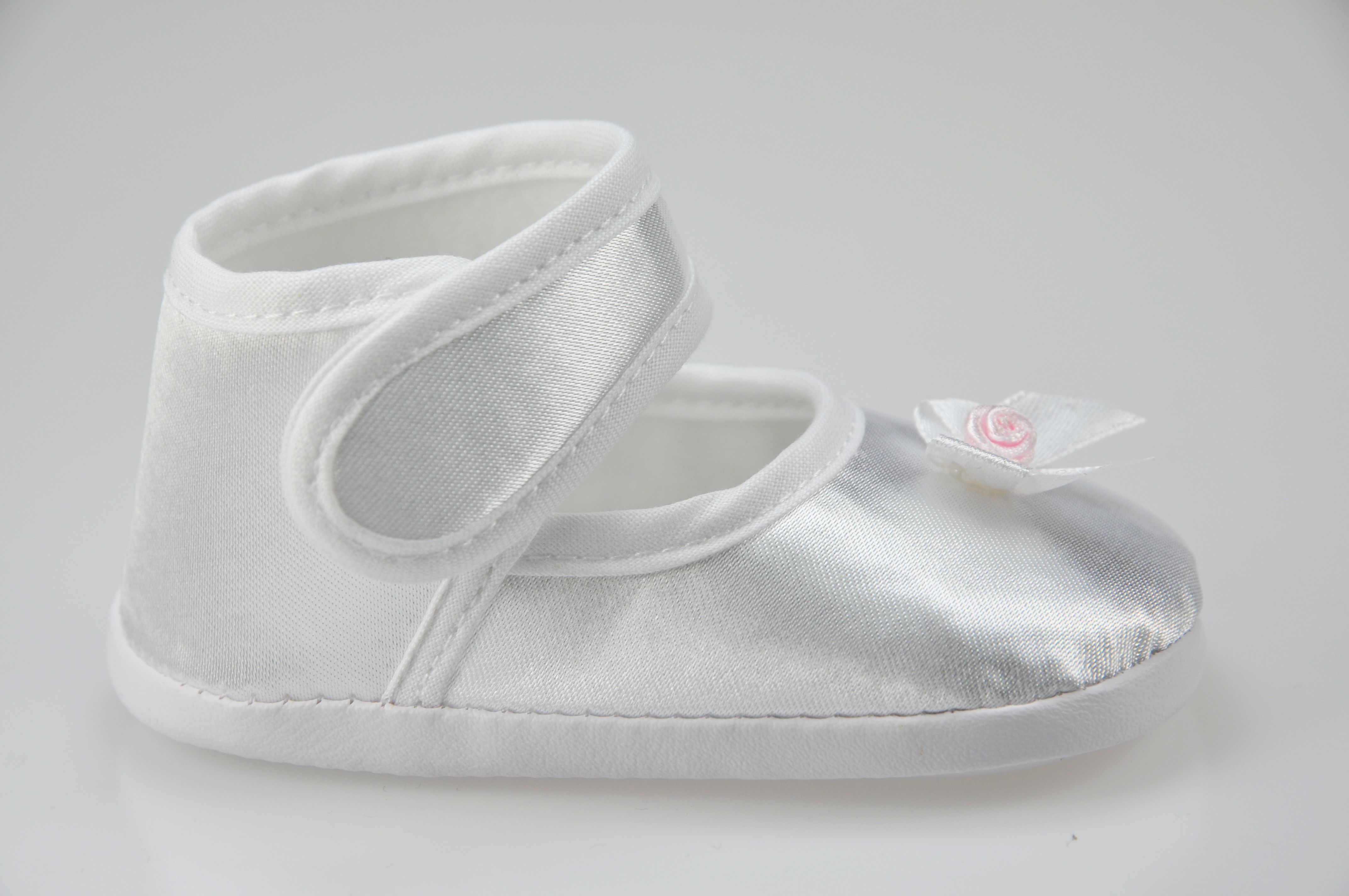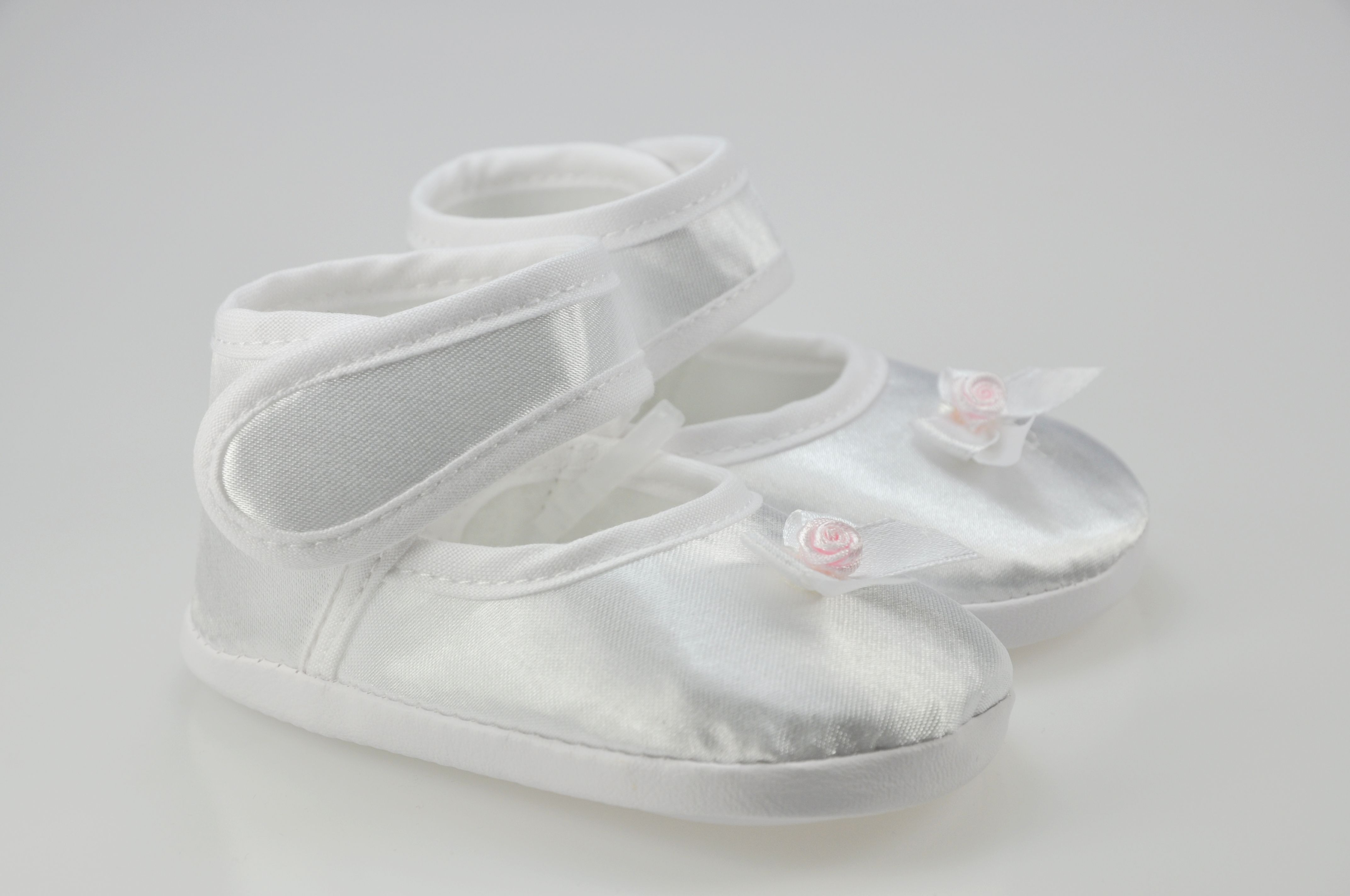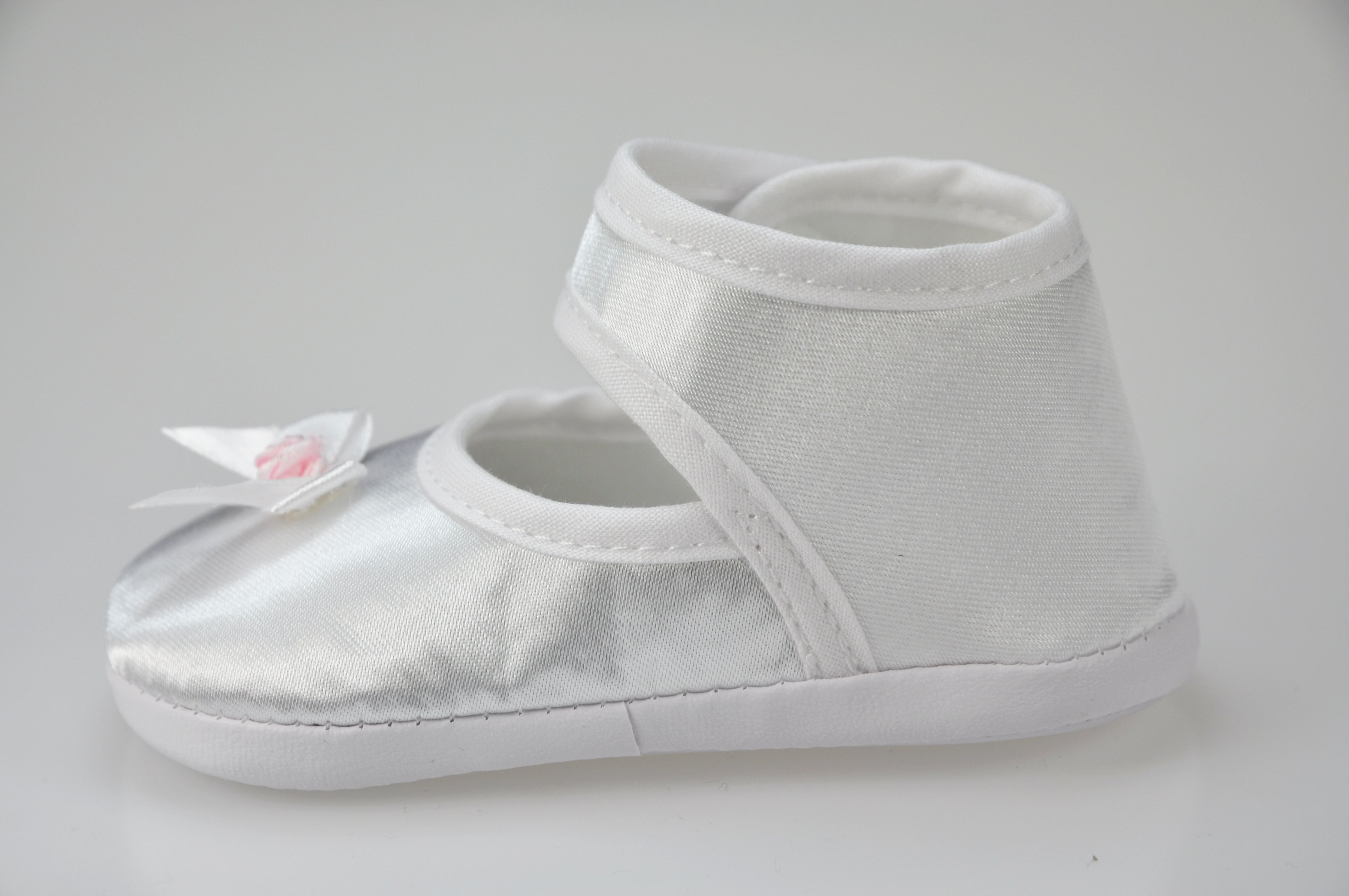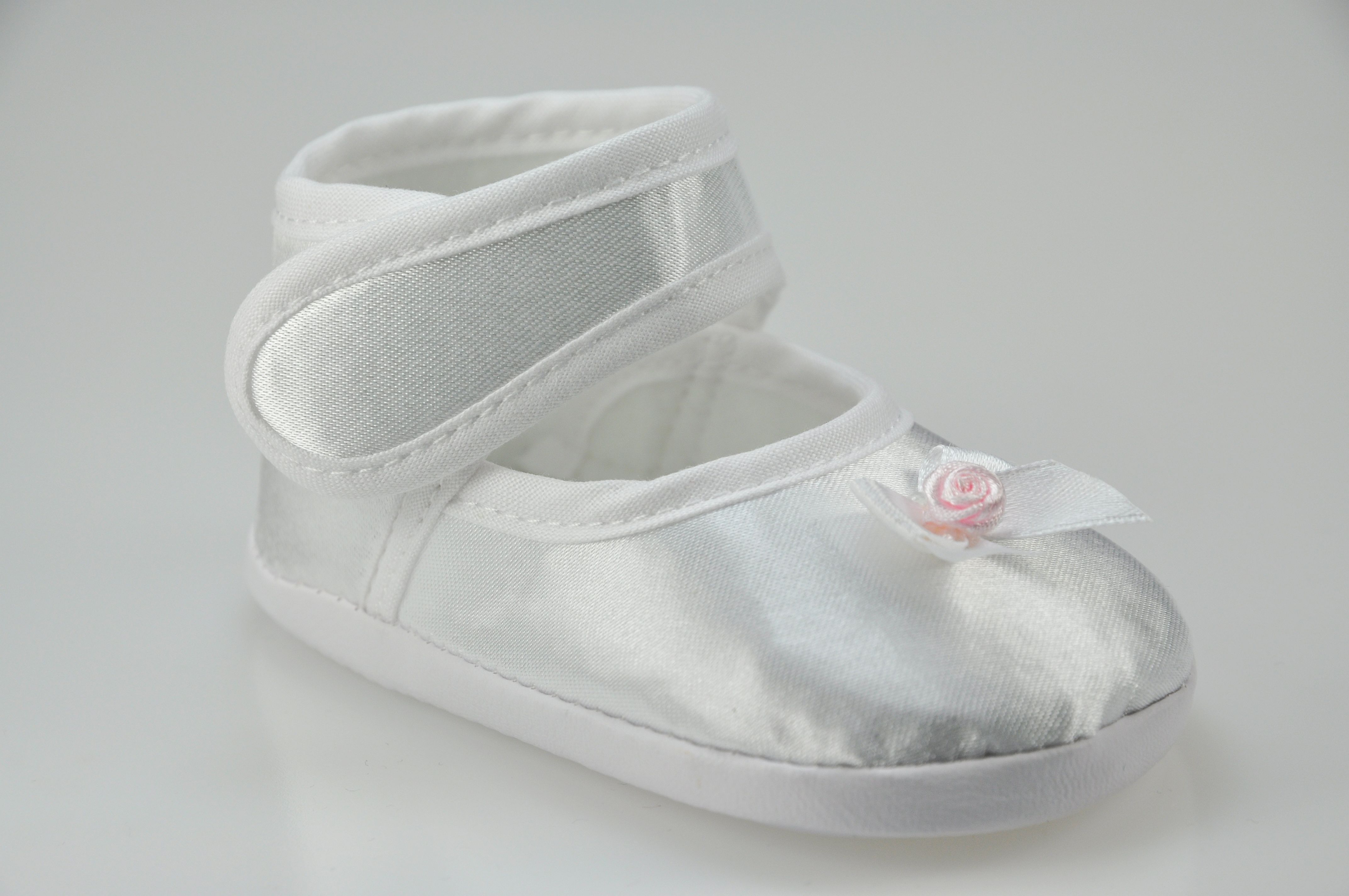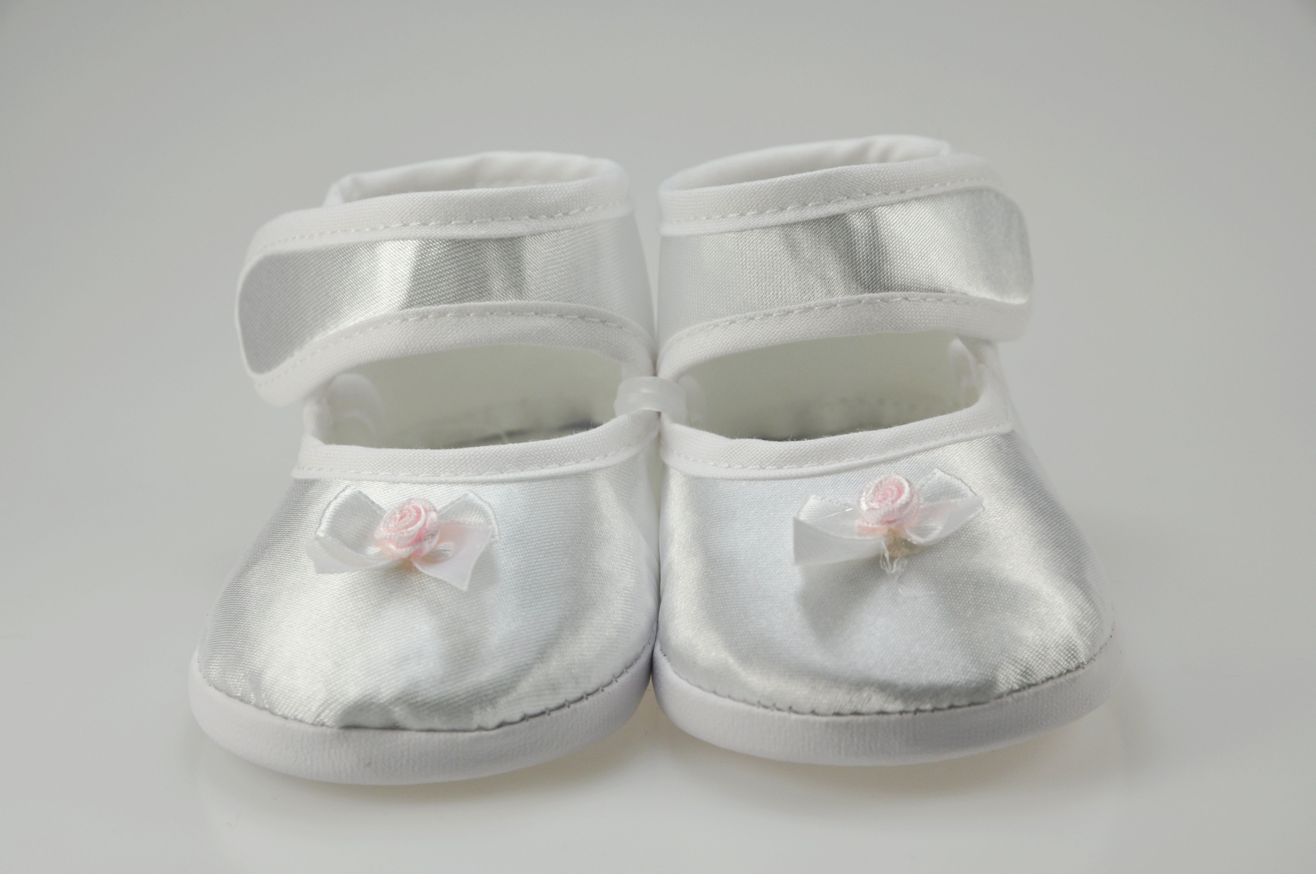 Buciki niemowlęce do chrztu , zapinane na rzep , z ozdobą z przodu bucika .