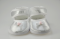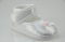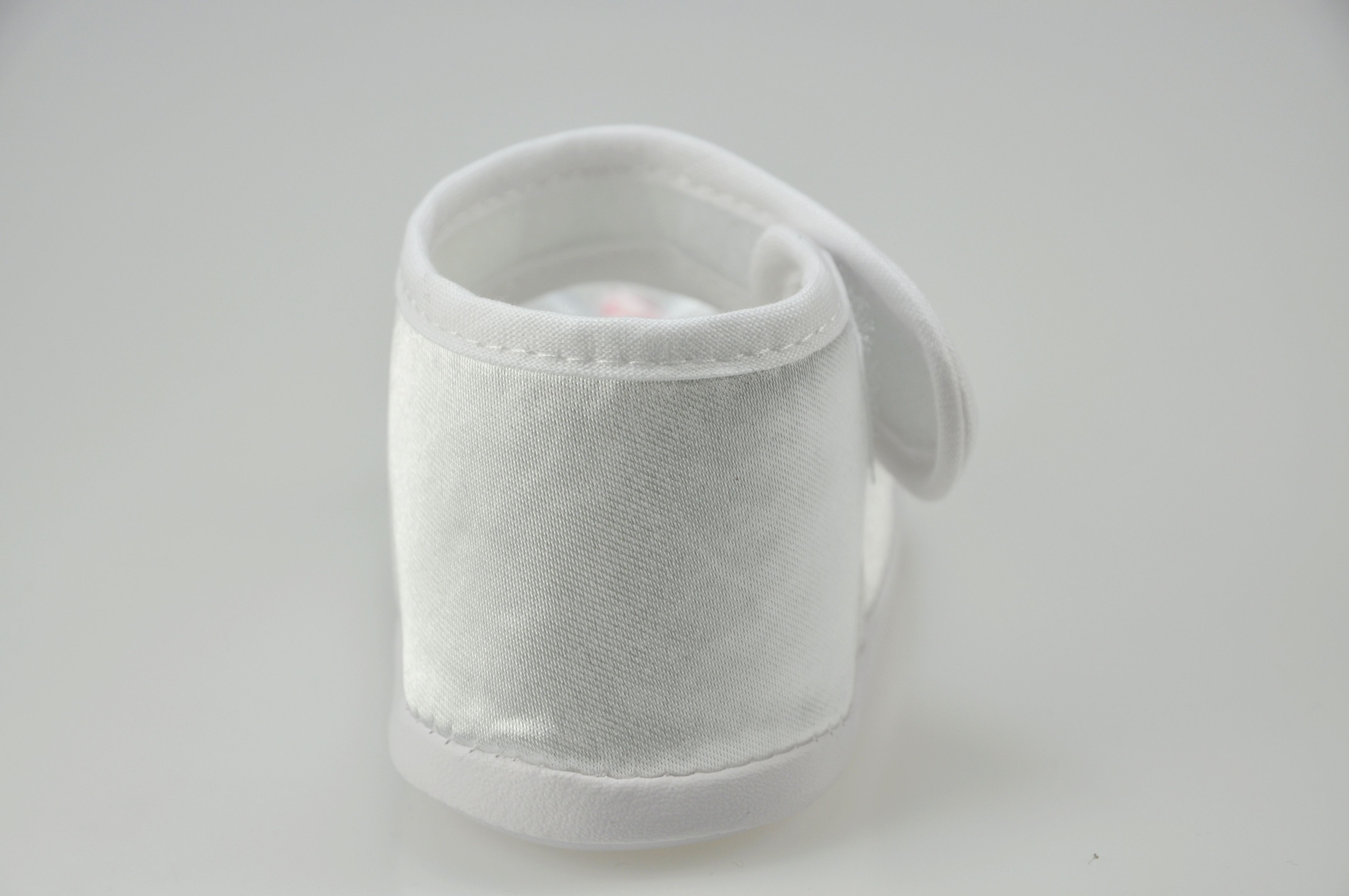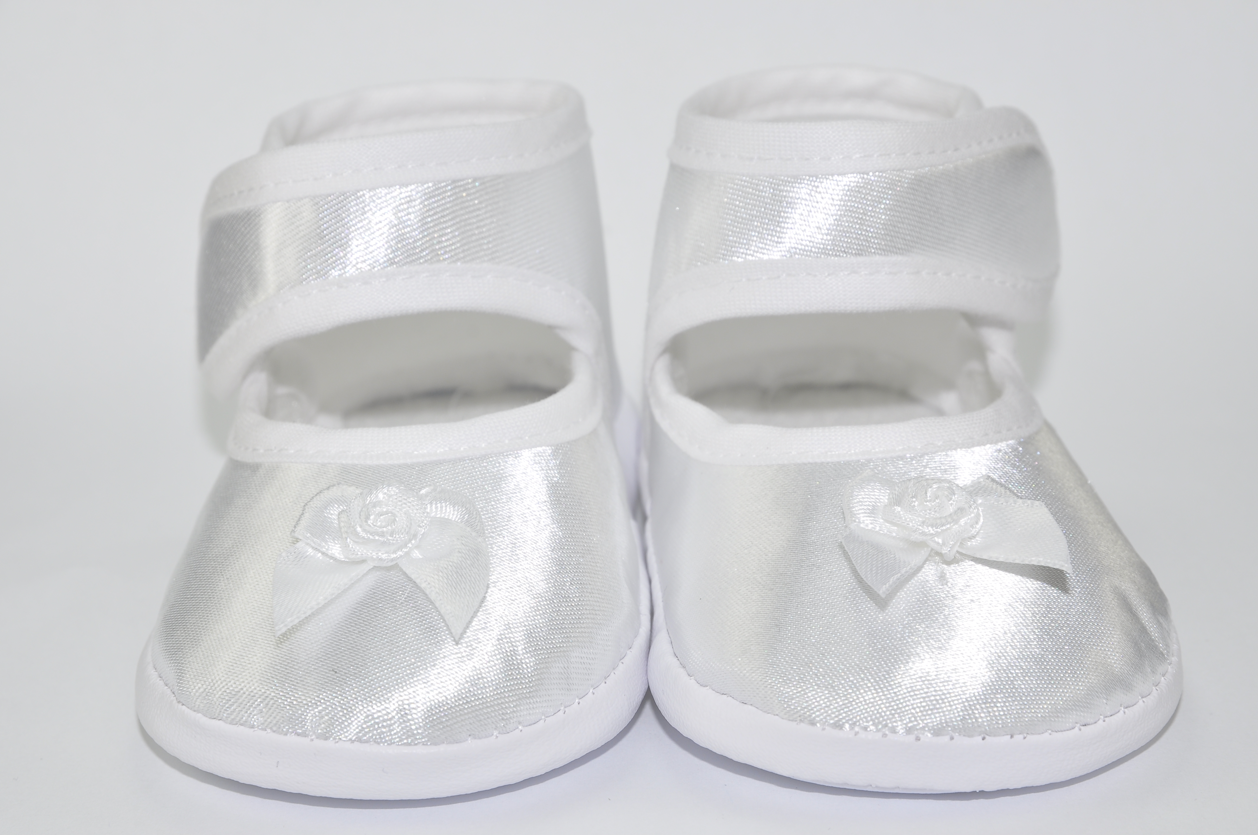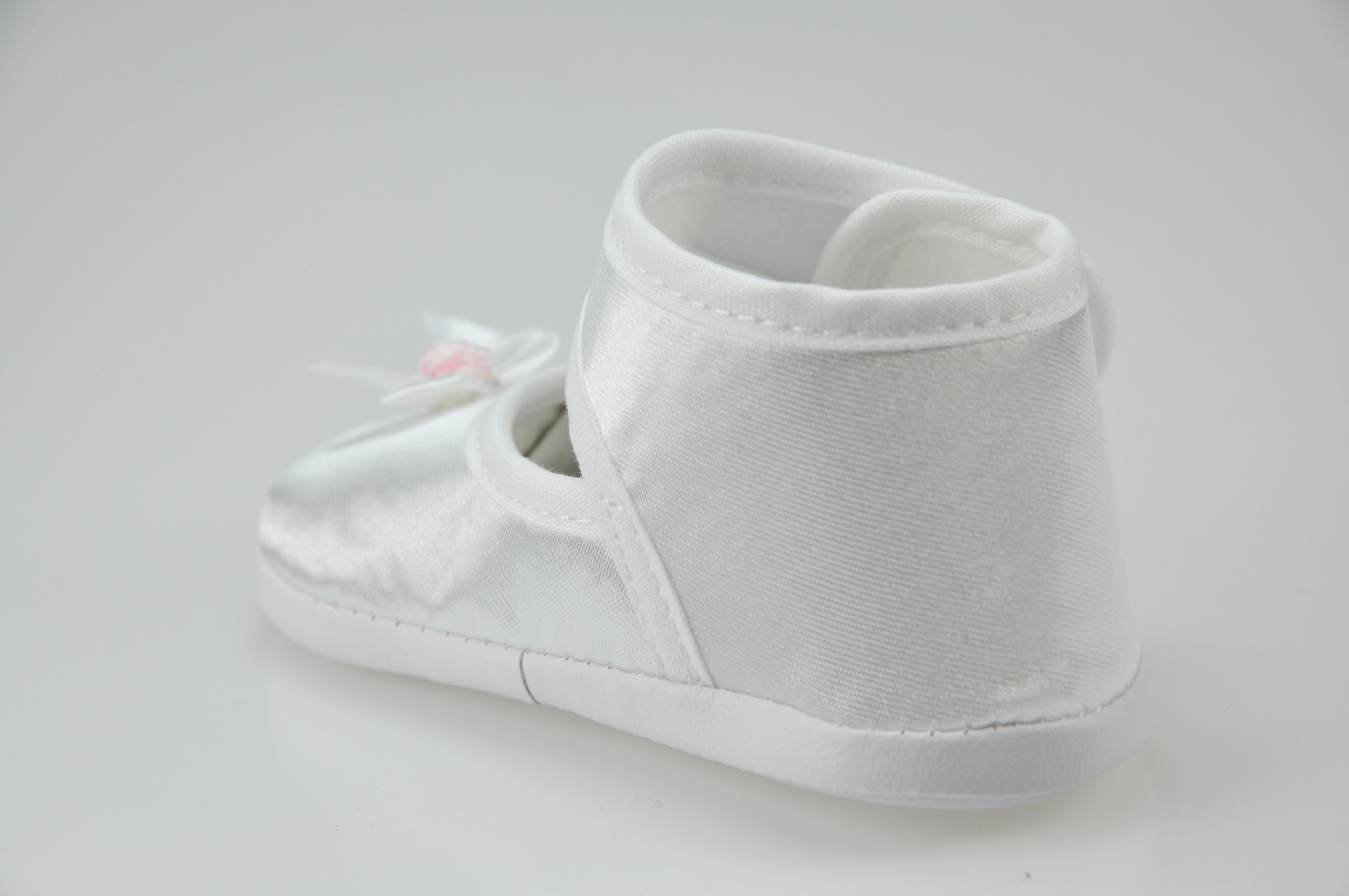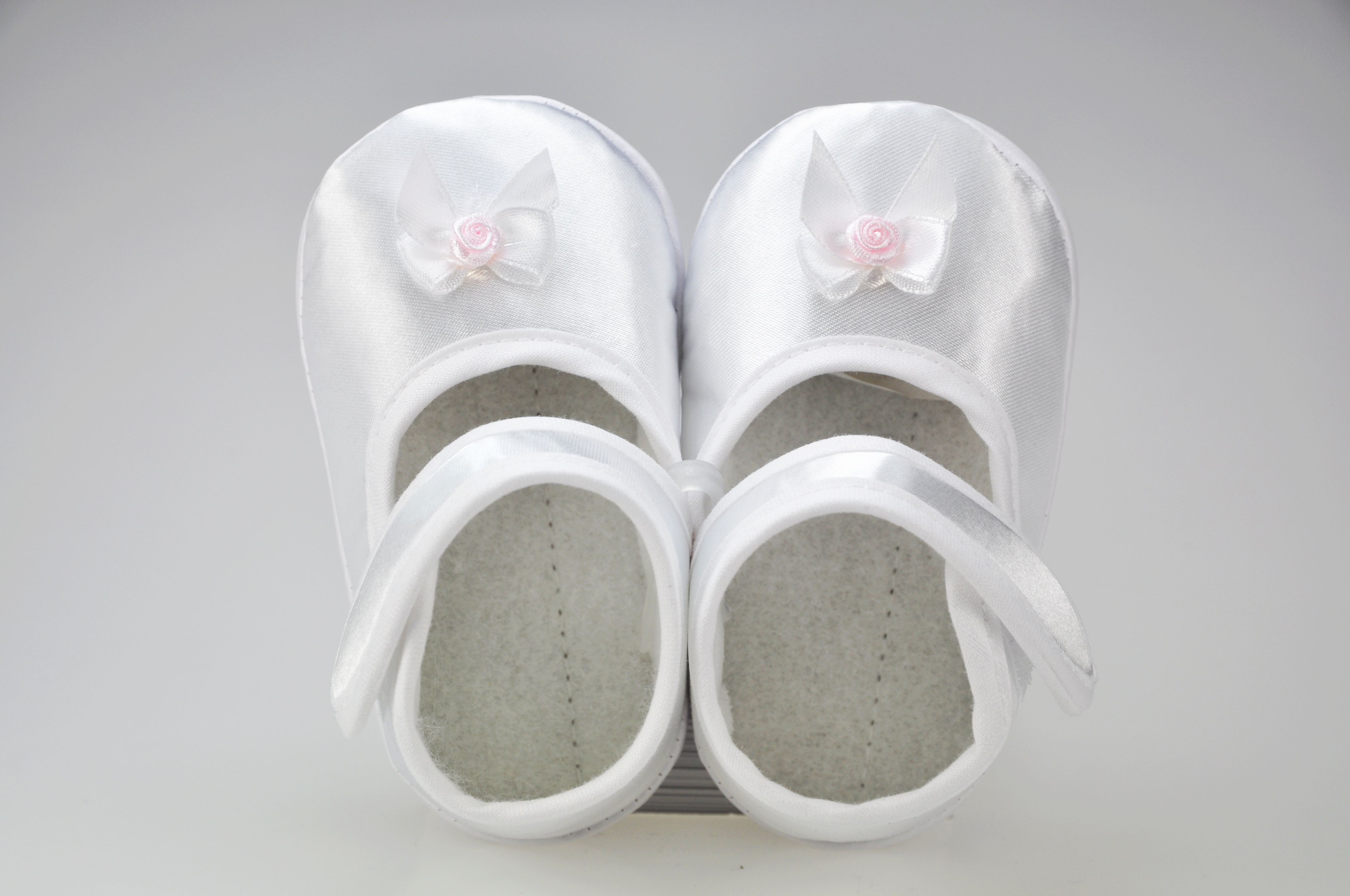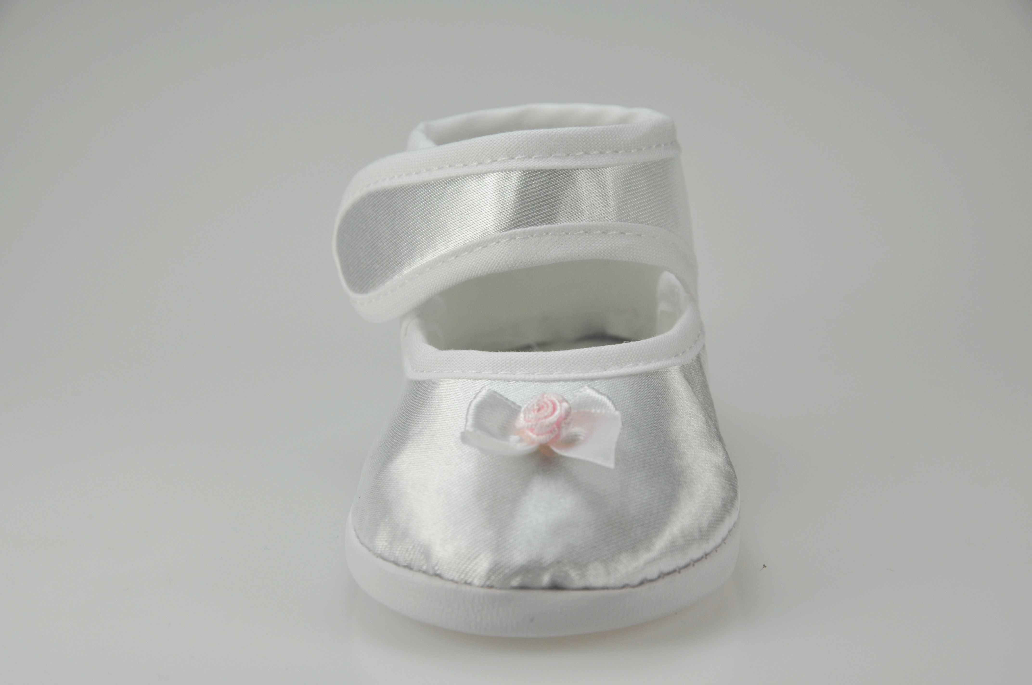 Buciki niemowlęce do chrztu , zapinane na rzep , z ozdobą z przodu bucika .