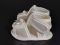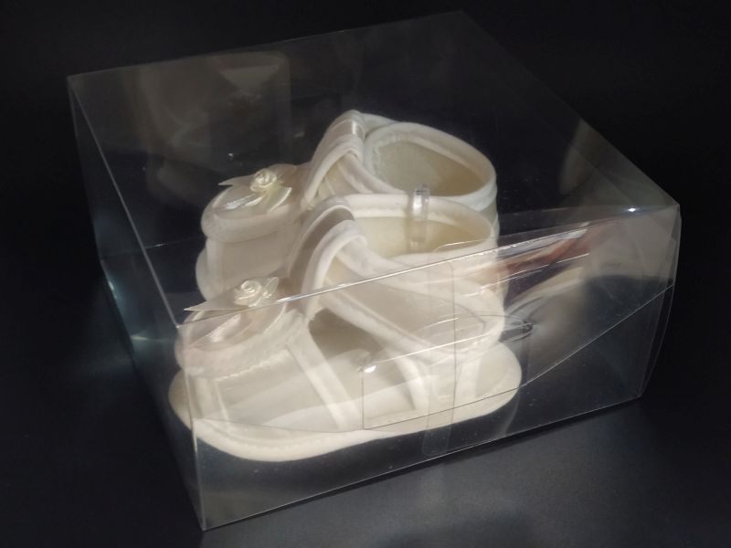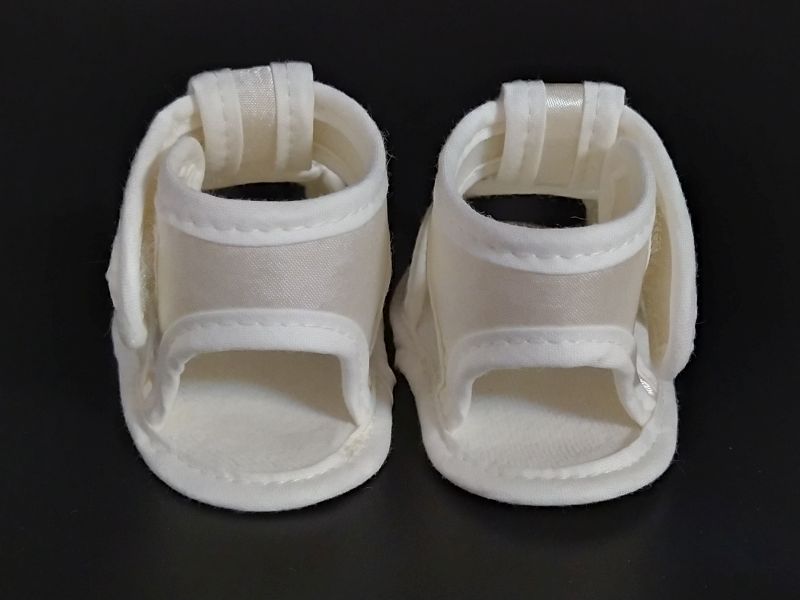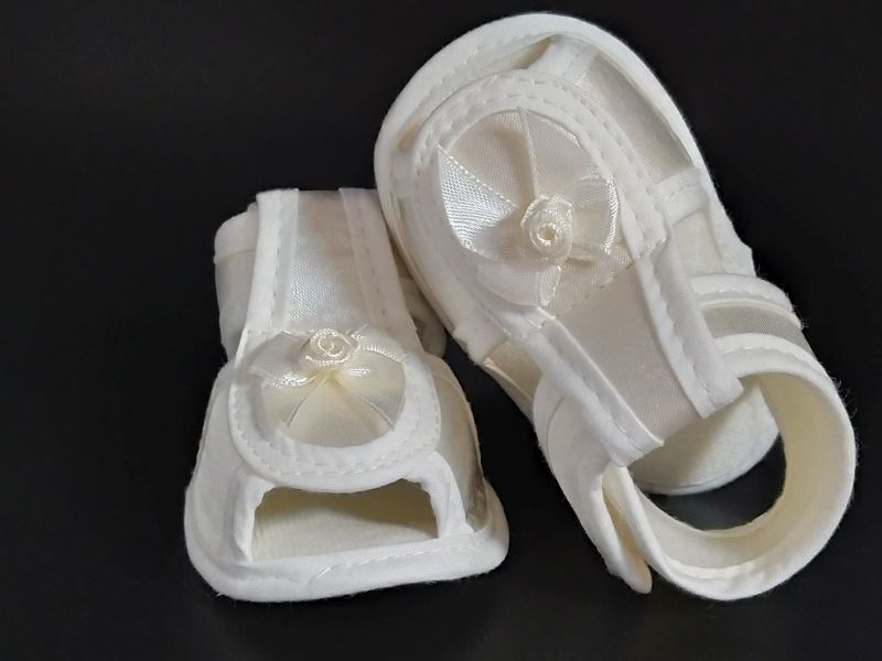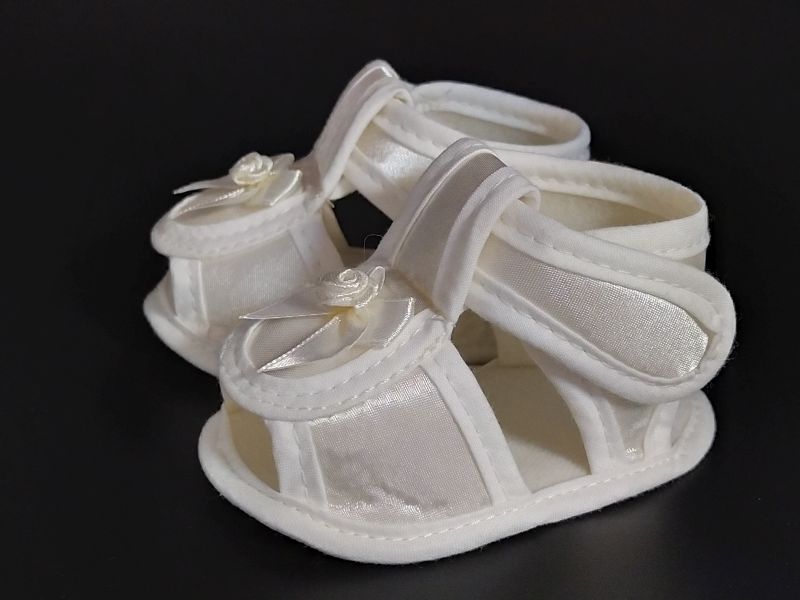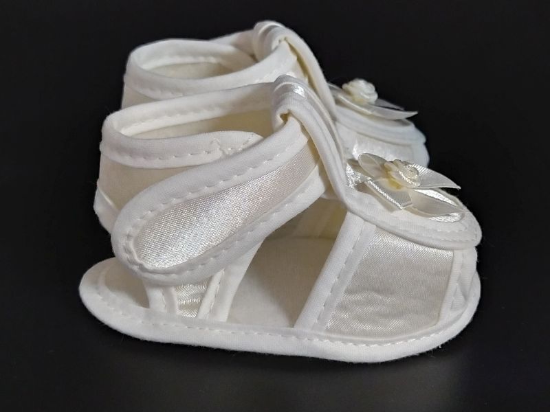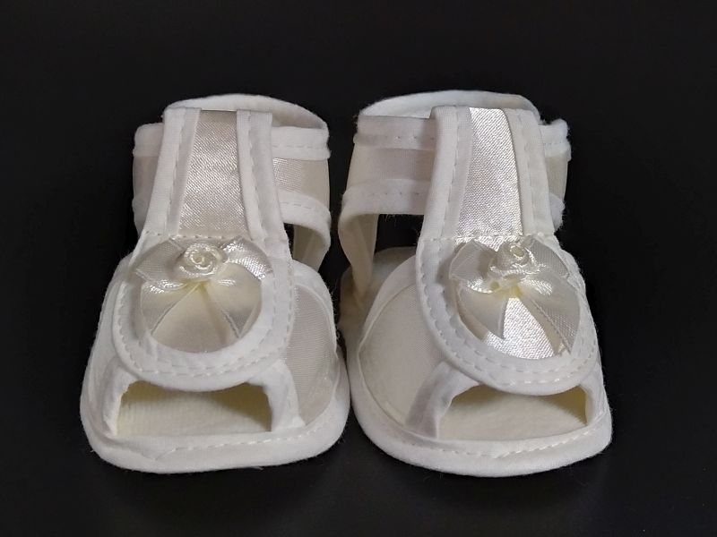 Buciki niemowlęce do chrztu , zapinane na rzep , z ozdobą z przodu bucika .