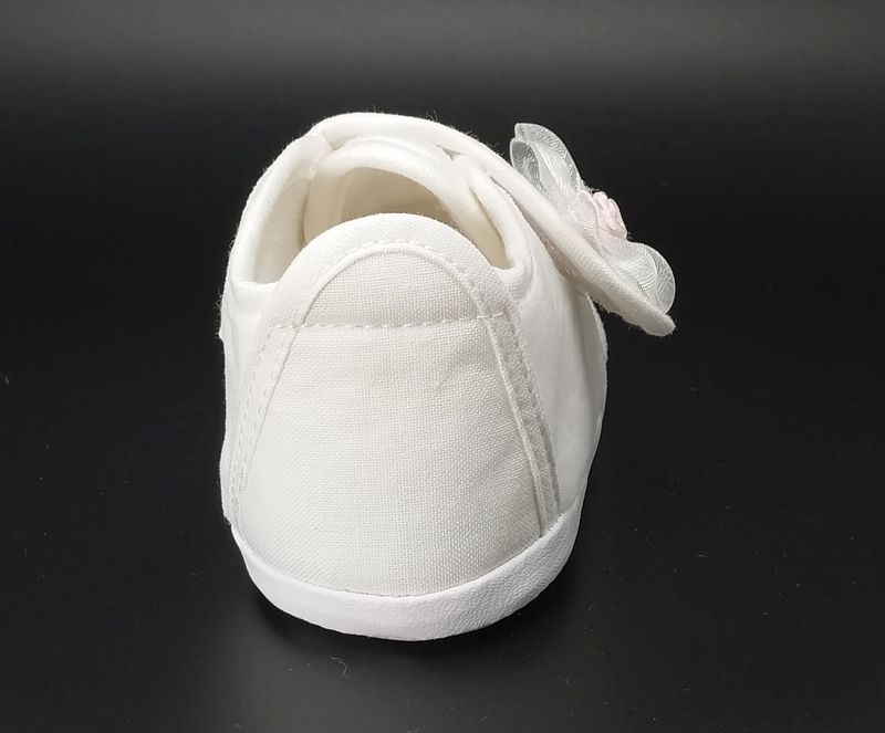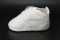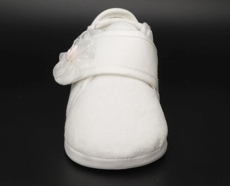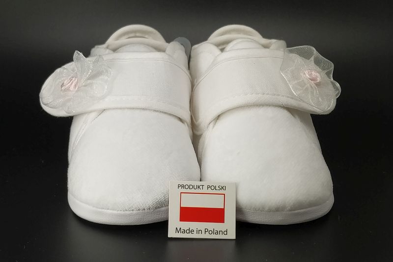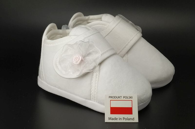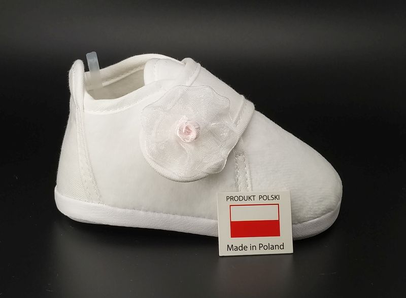 Buciki wykonane z białego weluru , zapinane na rzep z ozdobą.