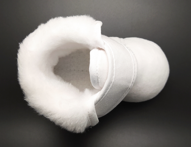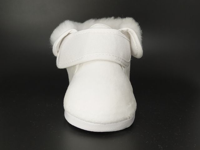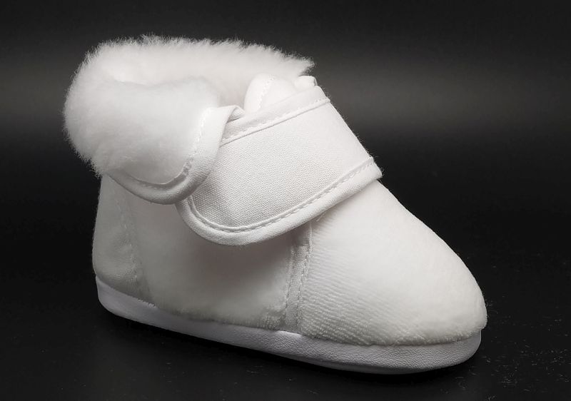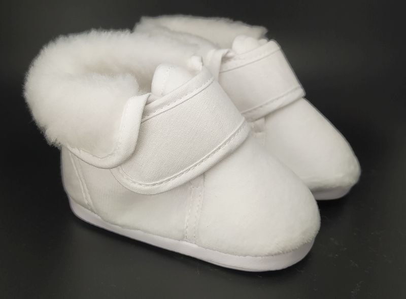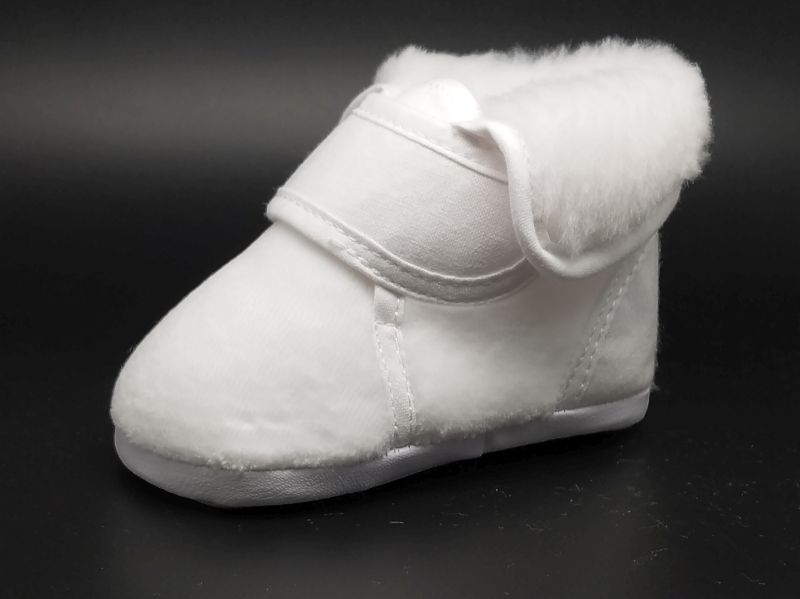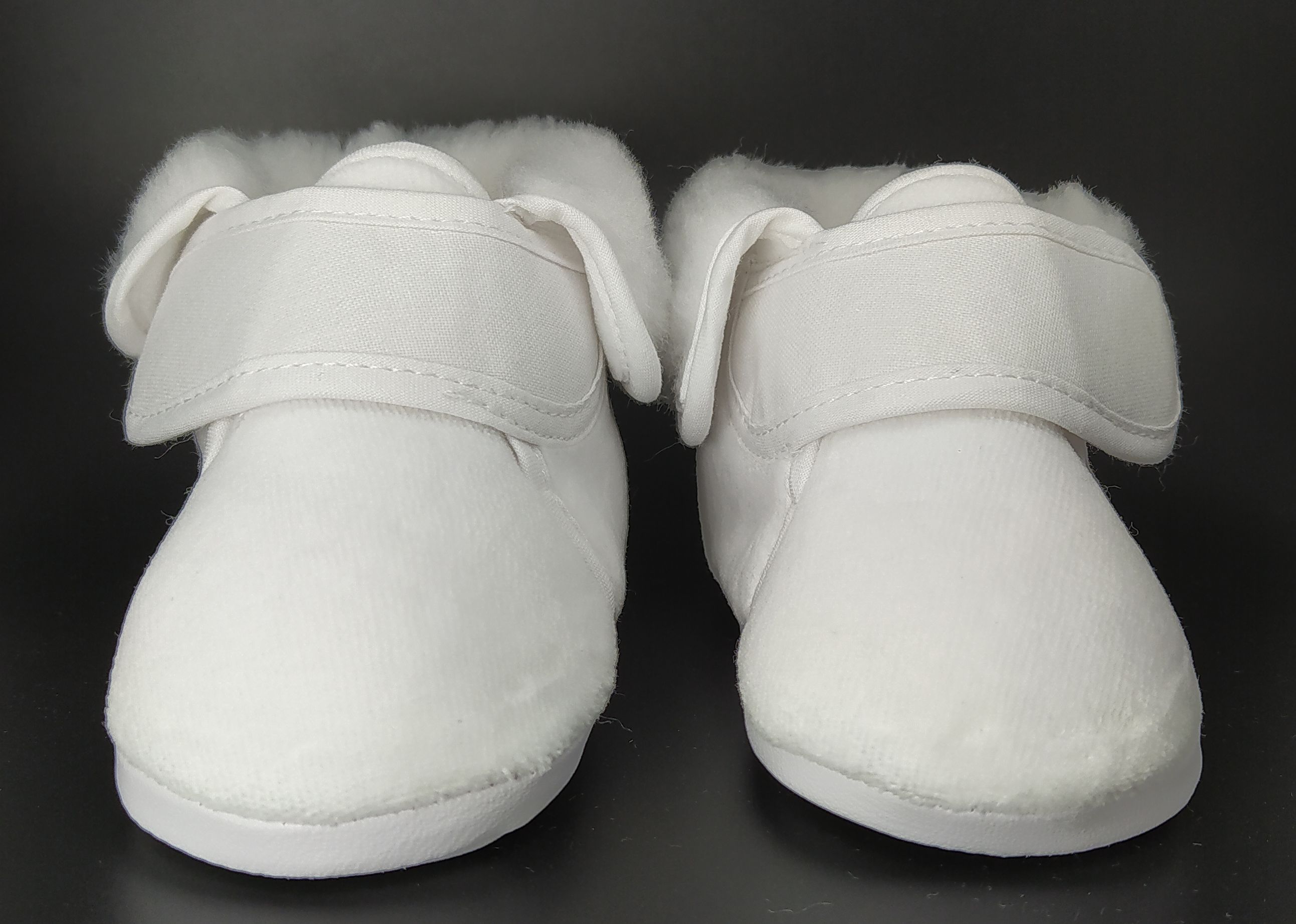 Trzewiki wykonane z białego weluru zapinane na rzep ocieplone białym futerkiem .