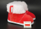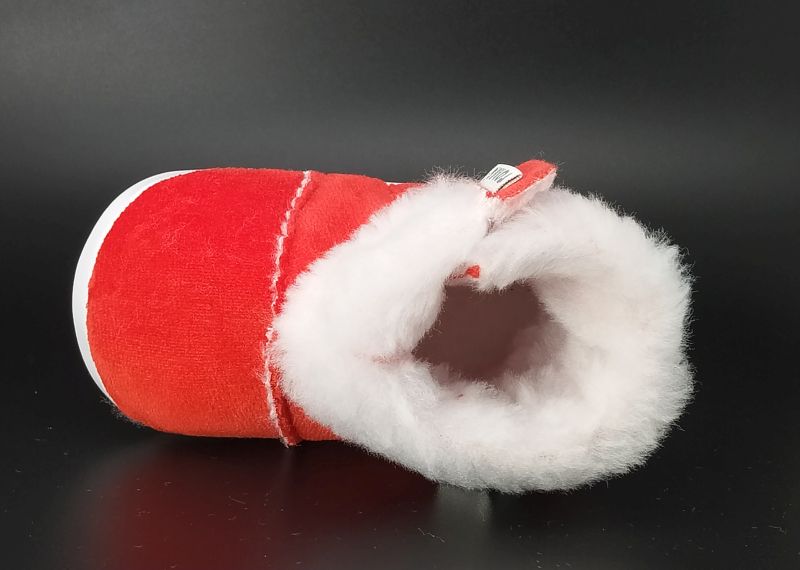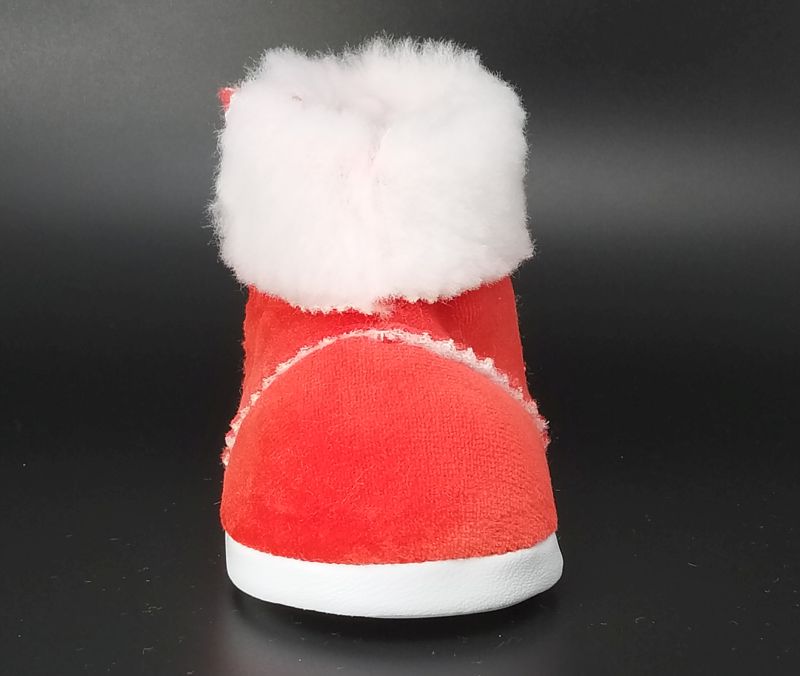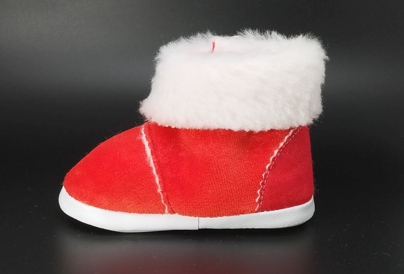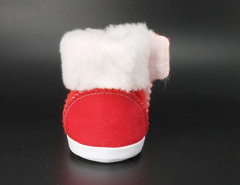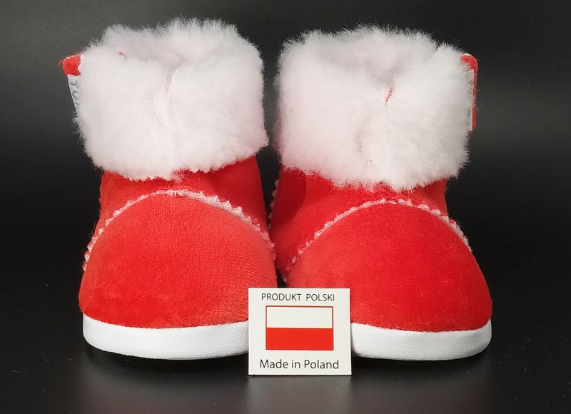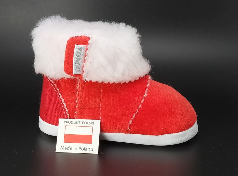 Kozaczki wykonane z czerwonego weluru , zapinane na rzep , ocieplone białym futerkiem .