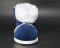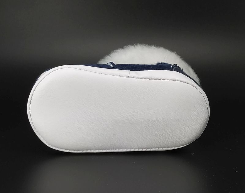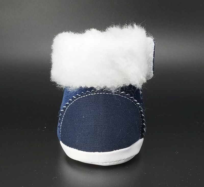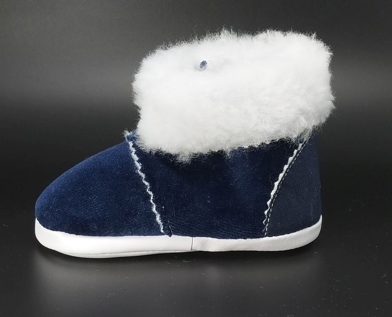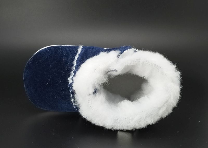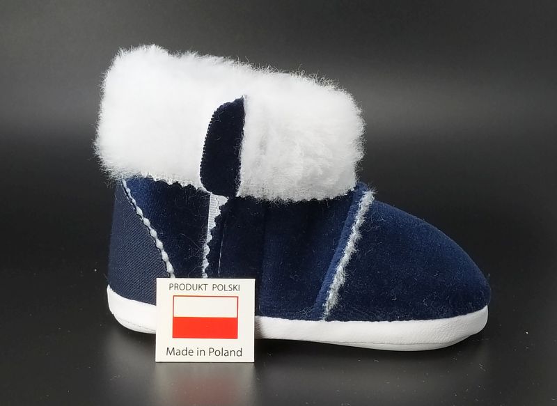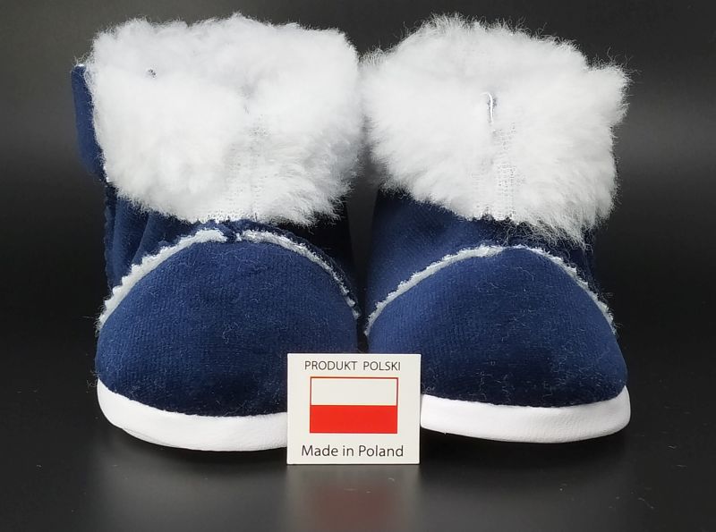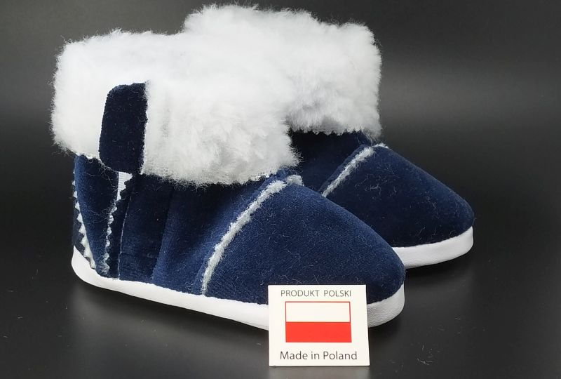 Kozaczki wykonane z granatowego weluru , zapinane na rzep , ocieplone białym futerkiem .